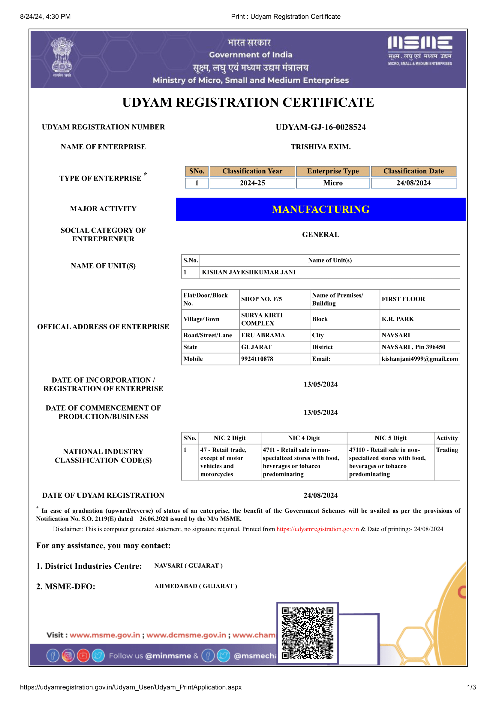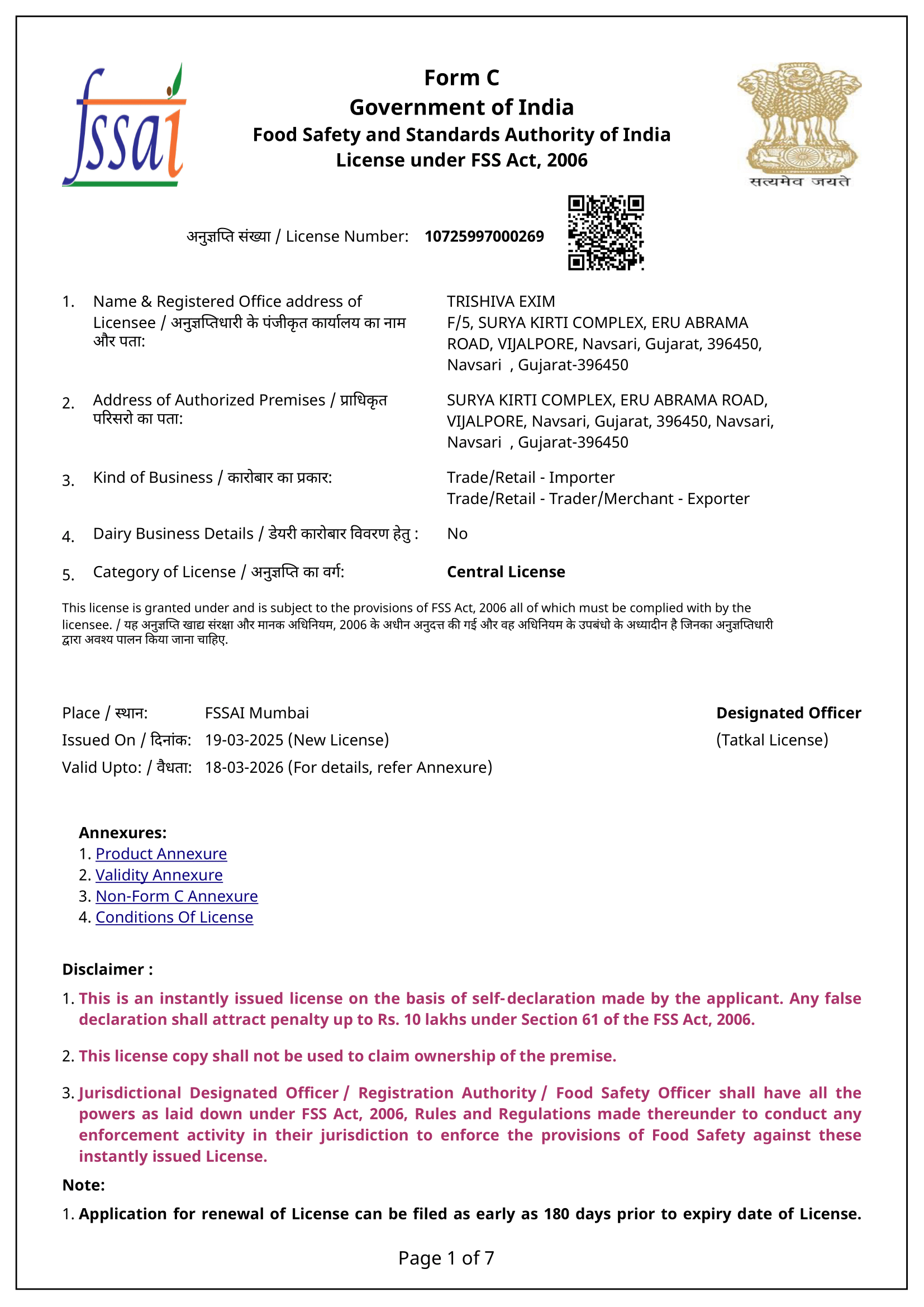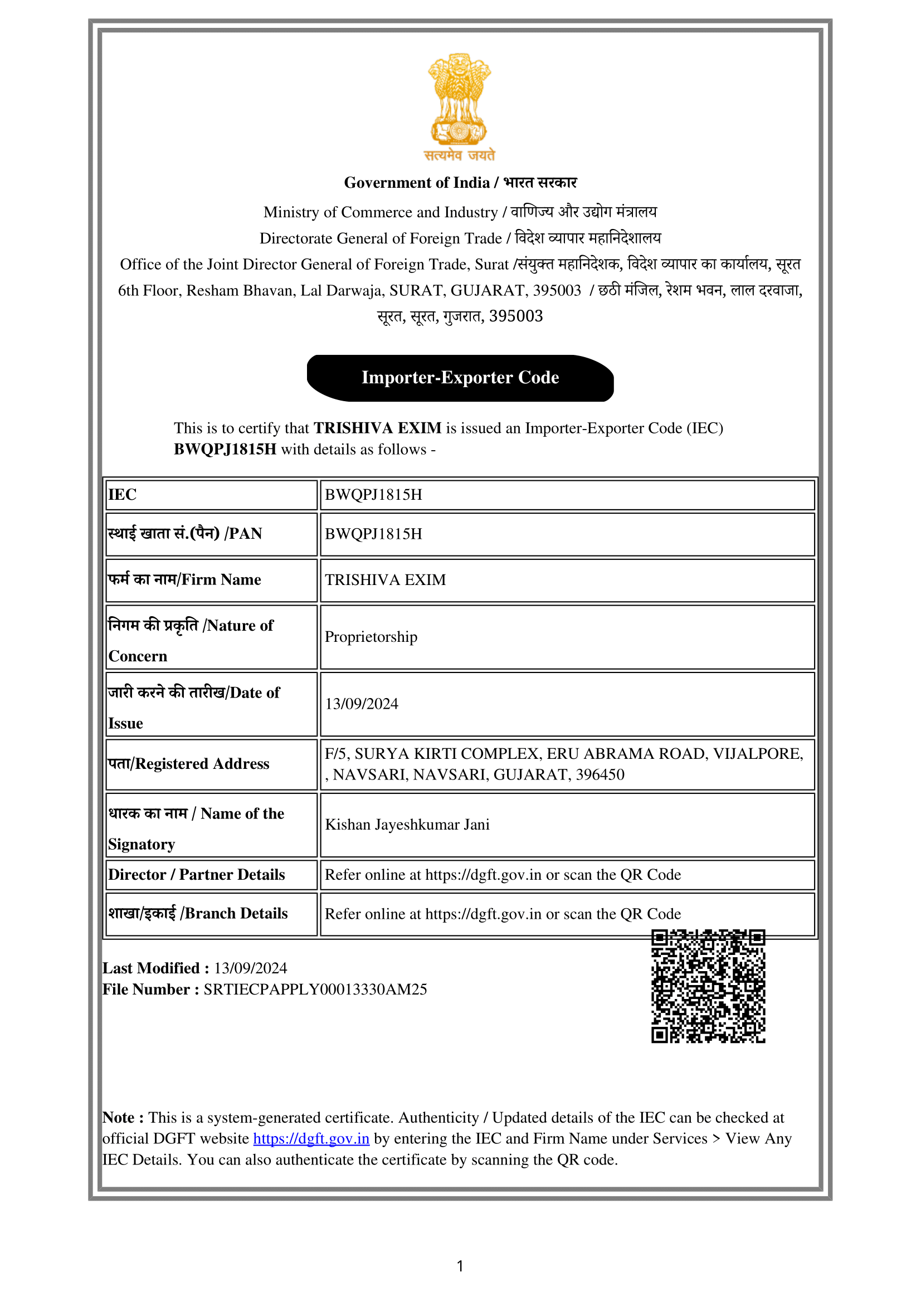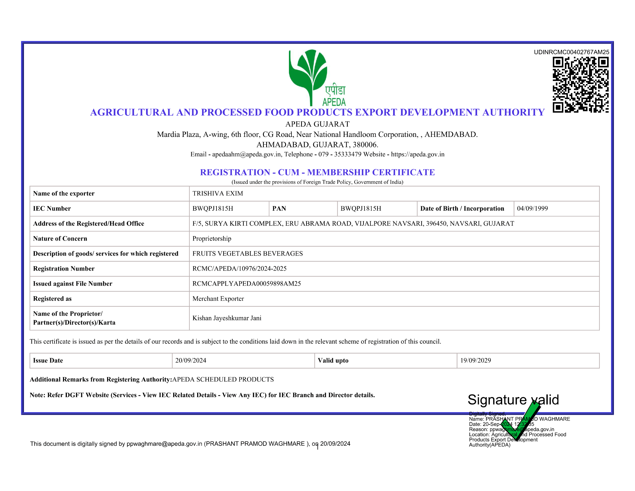 Certificates Udyam Registration Certificate – Trishiva Exim GST – Trishiva Exim Fssai License – Trishiva Exim RCMC – APEDA – TRISHIVA EXIM IEC code Verified – Trishiva Exim